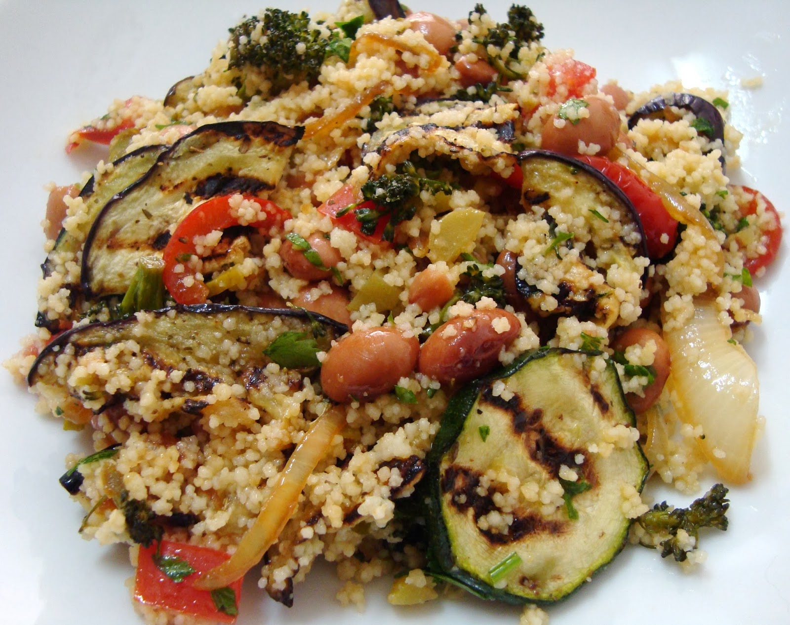 - Soltar os couscous com um garfo e juntar o feijão, o tomate, os pepinos, a salsa, os legumes grelhados e a mistura de bróculos.