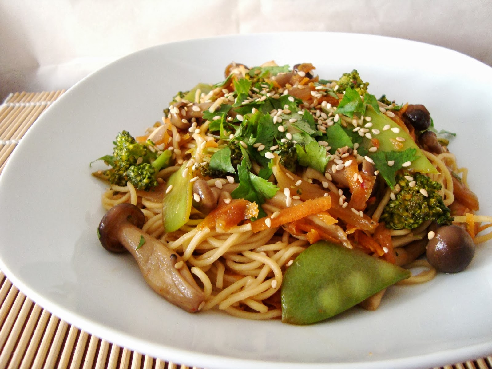 Juntei-lhes uns cogumelos diferentes do habitual que comprei no supermercado e o resultado foram uns deliciosos noodles com sabores orientais, simples e bem rápidos, perfeitos para um almoço sem grandes trabalhos.