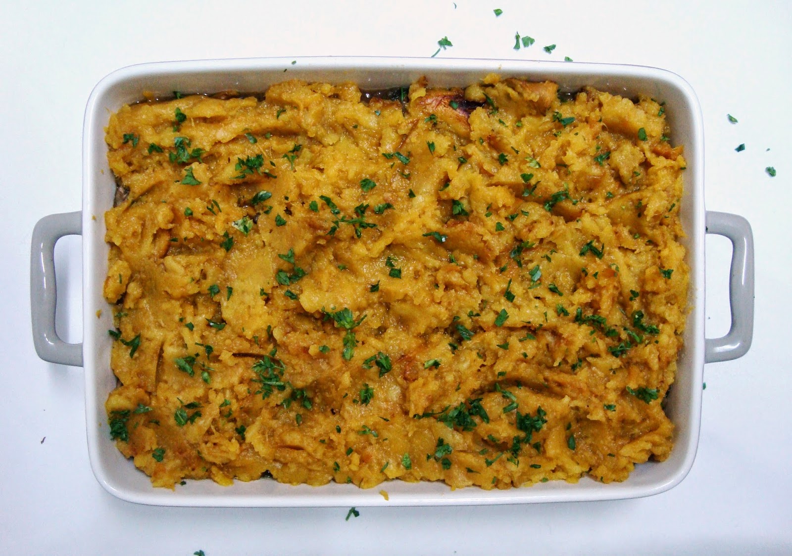 Esta é uma receita que faço várias vezes e já experimentei com variados purés: puré só de batata, puré de batata e couve-flor, puré de batata doce amarela e puré de batata doce laranja assada, que aqui mostro, que é de todos o meu favorito para este prato.